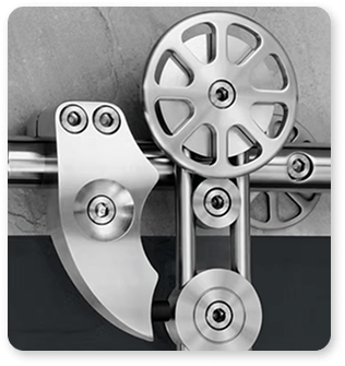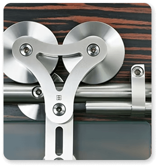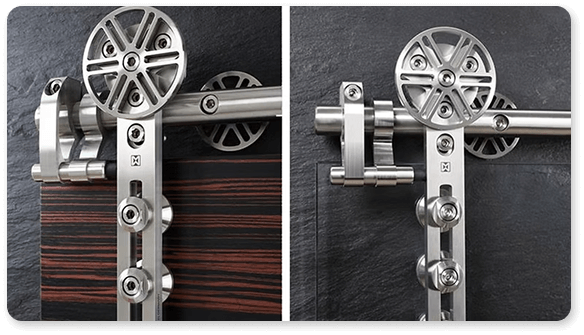 An ingenious solution to the often-desired floor-to-ceiling design, this two-wheeled system is an opulently fresh, tailored approach to the barn style door.