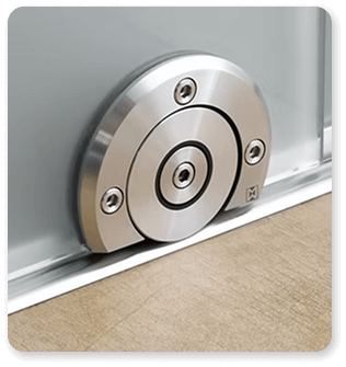 Terra M is the third model from the Terra series designed for installations where the sliding door system cannot be mounted to the ceiling. This unique modern design incorporates a semi-circle shell to encase the wheel permitting the wheel to be positioned directly beneath the glass. Its distinctive feature. Terra M is designed for glass doors only. The Terra also comes in an XL model that can support staggering weights of 970lbs.