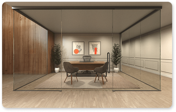 5. A single sliding panel represents the fundamental configuration of the system, facilitating movement between spaces. Moreover, for ceiling and wall installations, the choice of a sliding panel + fixed glass is also available.
